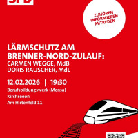 Unter dem Titel „Lärmschutz am Brenner-Nord-Zulauf“ lädt der SPD-Kreisverband Ebersberg am Donnerstag, 12. Februar, um 19.30 Uhr zu einer Gesprächsrunde mir und der Bundestagsabgeordneten Carmen Wegge in die Mensa des Berufsbildungswerks Kirchseeon (Am Hirtenfeld 11) ein.